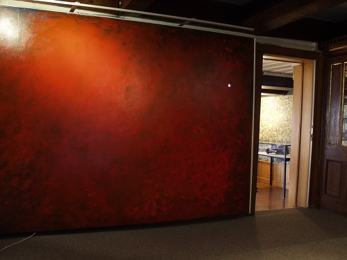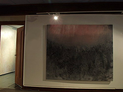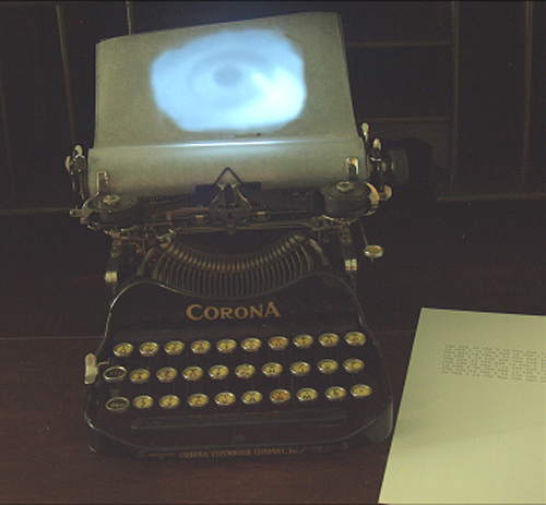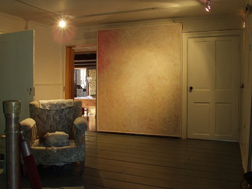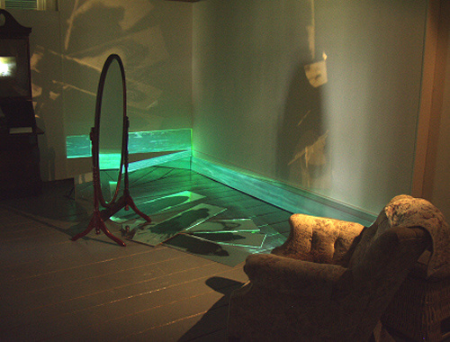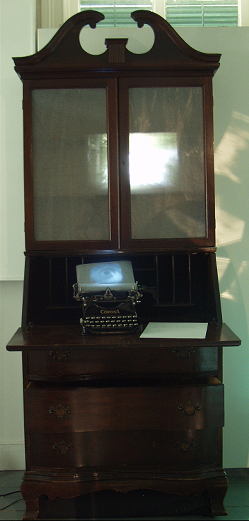 Alice Austen House Museum, Staten Island, NYC; interstices, by AM Hoch: site-specific installation, 2002A. M. HOCH, interstices, site-specific installation at Alice Austen House Museum (2002): shot of entry with oil on canvas painting: September 11 (large), 58 x 68 inches, 2001A. M. HOCH, September 11 (large), oil on canvas, 58 x 68 inches, 2001A. M. HOCH, (exhibited on adjacent wall in entry): September 11 (small), oil on canvas, 48 x 60 inches, 2001A. M. HOCH, interstices, site-specific installation at Alice Austen House Museum (2002): September 11 Mural, in entry to Alice Austen House; painted with acrylic glazes, with small eye hole cut out to see imbedded video of harbor shoreline, 2002A. M. HOCH, DETAIL of September 11 Mural with embedded video of super-8 film of harbor shoreline A. M. HOCH, interstices, DETAIL: living room with paintings on mirrors, video projections on baseboards, bureau with camera obscura, and video loops hidden inside various furniture and household objects, 12 x 15 feet, 2002A. M. HOCH, interstices, DETAIL: video projection with mirrors, cast shadows, and painted mirrors, 2002A. M. HOCH, interstices, DETAIL: painted mirrors on floor A. M. HOCH, interstices, DETAIL: ripped-open chair with embedded video loop of child’s hand touching surfaces inside the house, 45 inches x 31 inches x 33 inches, 2002A. M. HOCH, interstices, DETAIL: armoire with embedded camera obscura reflecting the outside lawn and harbor, and typewriter with embedded video; 76 inches x 43 inches x 25 inches, 2002A. M. HOCH, interstices, DETAIL: typewriter with video loop of blinking eye projected onto pageA. M. HOCH, interstices, DETAIL: parlor with embedded videos (in shoe on top of basket and ink bottle on top of book), 2002A. M. HOCH, interstices, DETAIL: ink bottle with embedded video of woman riding a bicycle in circles; approximately 2.25 inches in diameter; 200217. A. M. HOCH, interstices, DETAIL: dining room with glass case of objects including sugar bowl with embedded video, 2002A. M. HOCH, interstices, DETAIL: sugar bowl with embedded video, 2002 A. M. HOCH, interstices, DETAIL: view of living room with glaze-painted mural with tiny eye hole on left with embedded video of hand continuously writing “the eye is the I is the eye …”, 2002A. M. HOCH, interstices, DETAIL: Detail of keyhole (in door in living room leading to secret staircase) with embedded video of a woman walking upstairs; approximately 0.5 inches in diameter; 2002