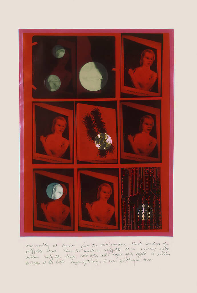 Imbedded in the collage to the right of the large triangular painting: “The chromosome is a kind of map of the cell’s invisible geography, a mythical ancestry, the Dreamtime of the Zygote. If an error occurs during the first mitotic splitting of the zygote—that is, if “an accident of non-dysjunction” occurs while the chromosomes attempt to divide for the first time—then a sexual ambivalence becomes imbedded on the cellular level. No memory of this leaden moment remains in the mature organism.”