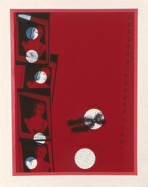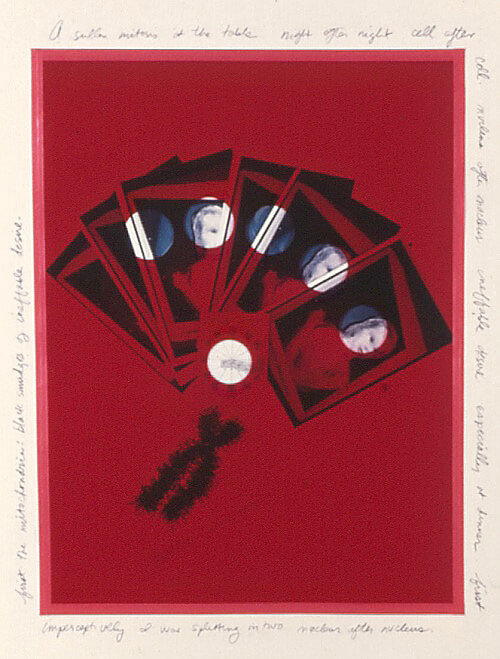 The Mitosis series (1989–1990) uses the process of cellular division as a metaphor to describe “the process of individuation,” piecing together a wry portrait of growing up in a family steeped in secrets and denial. The image of the chromosome and references to mitosis are woven throughout these three installations, which used shaped canvases stapled directly to the walls of my studio, incorporating objects and original text. The typed or handwritten texts—scrawled on a wall or embedded in found objects and collages—describe, in a coded, pseudo-scientific way, a history of sexual abuse.