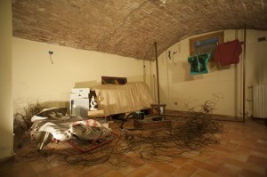 A. M. HOCH, Diary of a Young Boat in Three Movements: Young Boat in Bed (Third Movement), performance/ installation with cot painted mirror on pilllow, wires, found objects; dimensions variable, Cartoleria 18 Società Cooperativa; 2013