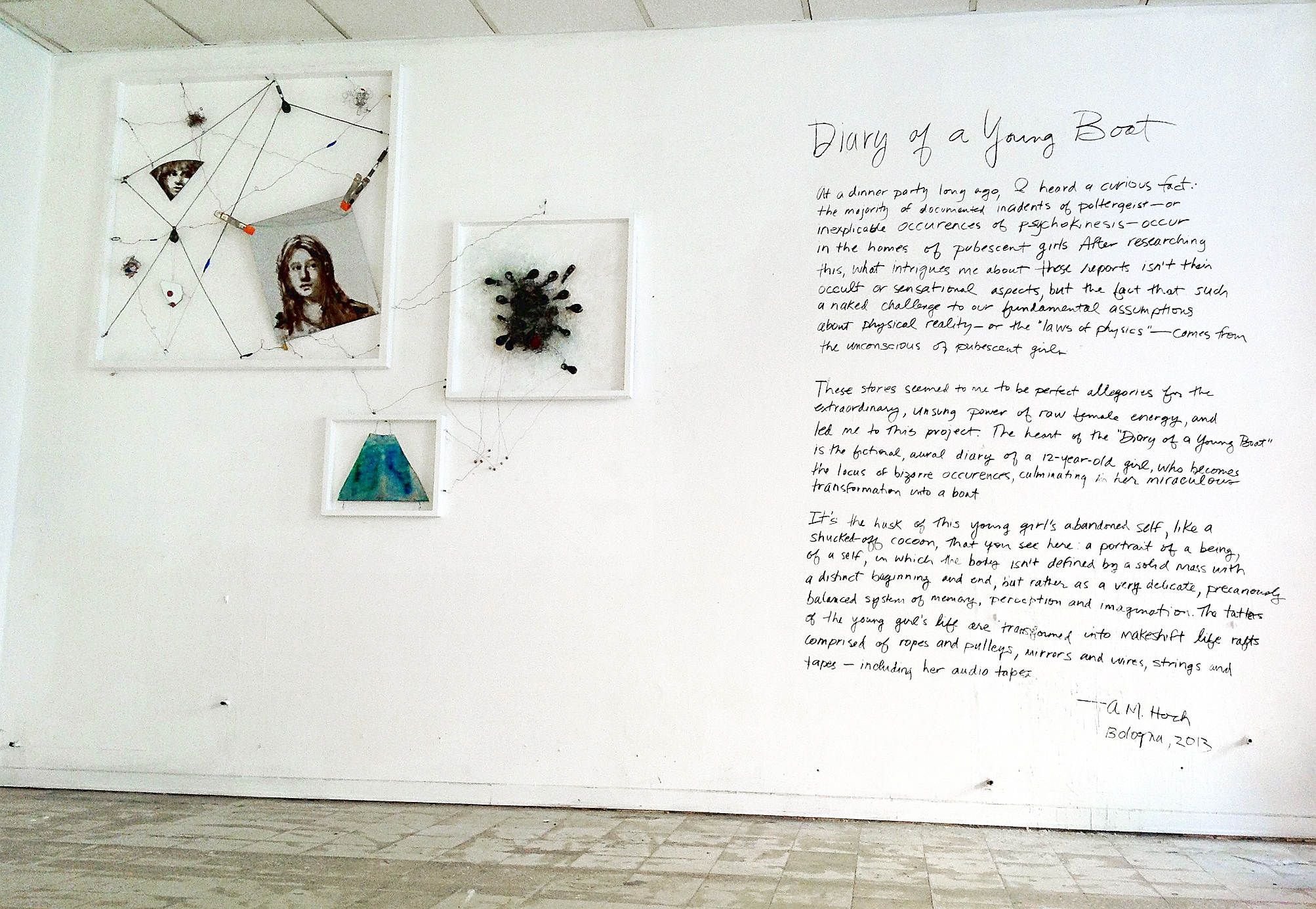 A. M. HOCH, Triptych for a Young Boat with Text, mixed media including painted mirror, painted pulleys imbedded in resin, wooden frames, and wires; 16.4 x 9.5 ft, 2013