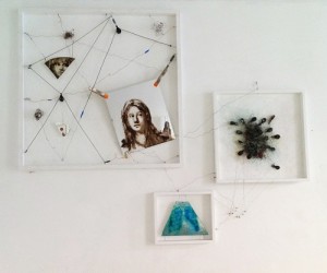A. M. HOCH, Triptych for a Young Boat, mixed media including painted mirror, painted pulleys imbedded in resin, wooden frames, and wires; 70 x 87 inches, 2013