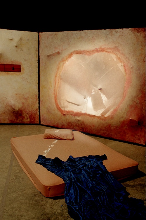 A. M. HOCH, Mitosis: Formation of Daughter Cells, DETAIL: projected video loop of continuous handwriting on mattress, 2004
