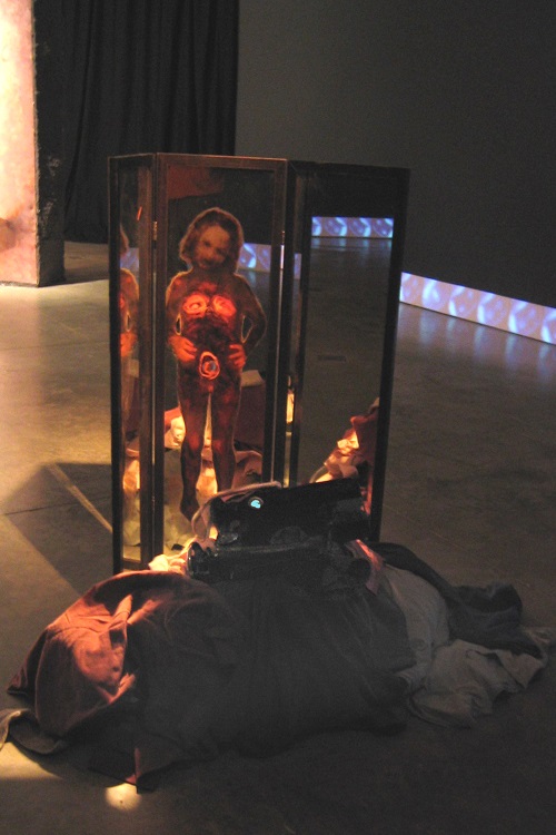 A. M. HOCH, Mitosis: Formation of Daughter Cells, DETAIL, painted mirror triptych (next to sewing machine with embedded video loop), 2004