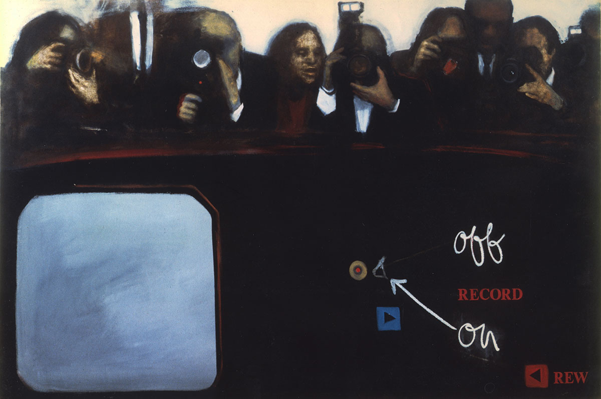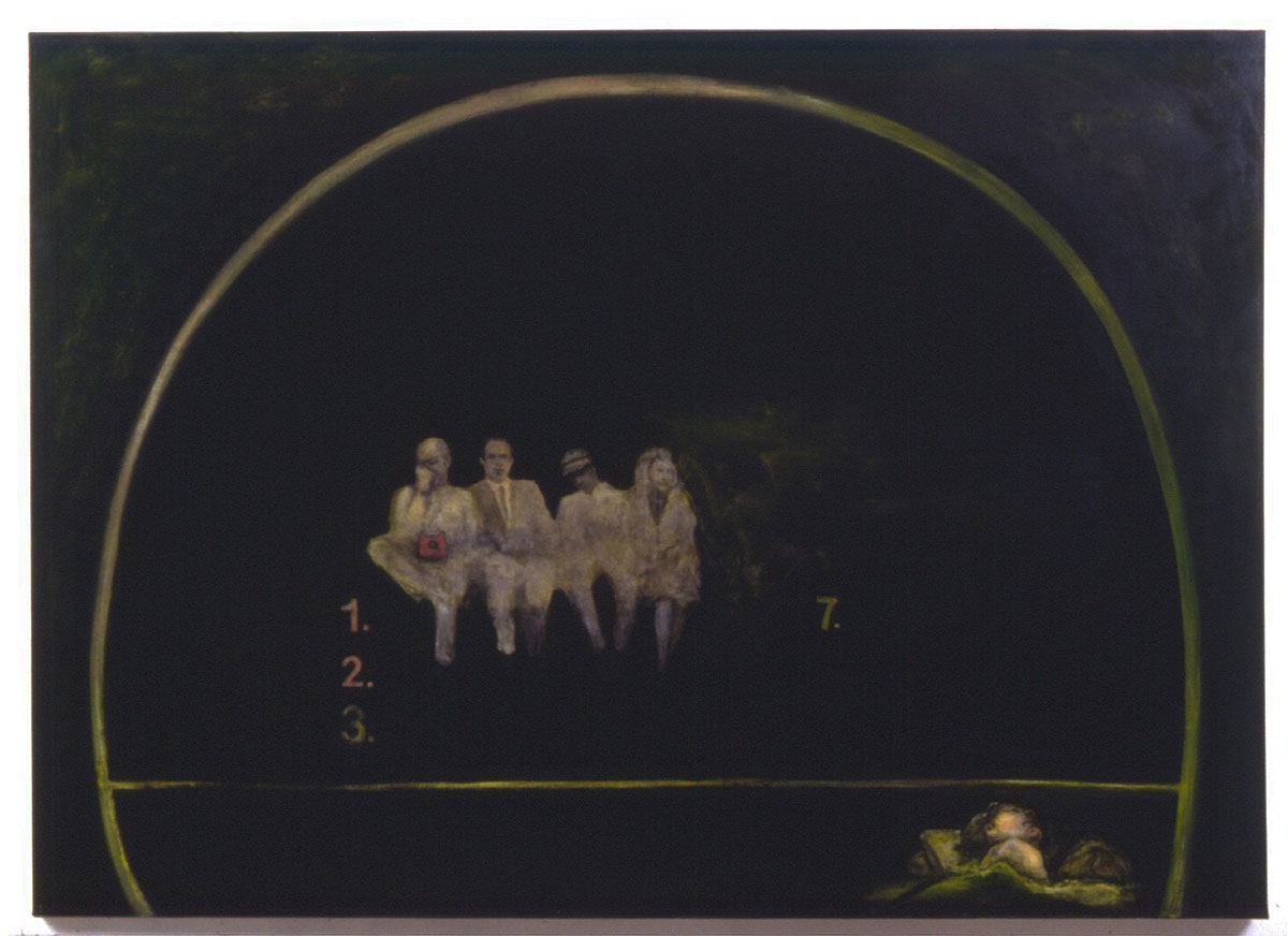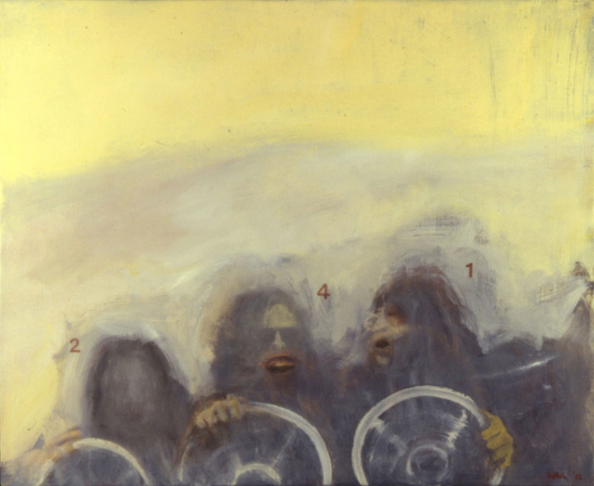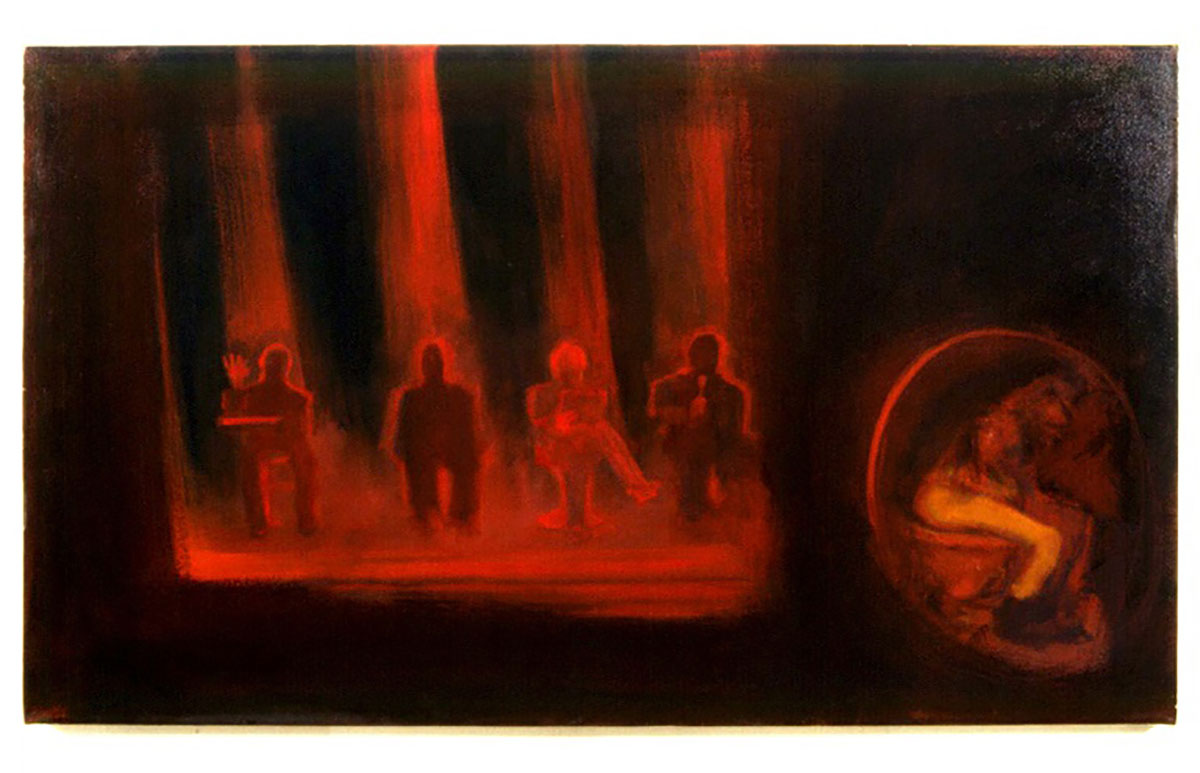 A. M. HOCH, One, Two, Three, Seven, oil on canvas, 64 x 90 inches, 1991 A. M. HOCH, Coup, oil on canvas, 62 x 72 inches, 1991 A. M. HOCH, On/Off/Record, oil on canvas, 56 x 84 inches, 1992 A. M. HOCH, Press Conference, oil on canvas, 52 x 72, 1991A. M. HOCH, Aftermath, oil on canvas, 56 x 90 inches, 1992 A. M. HOCH, Eating with Others, oil on canvas, 34.75 x 60 inches, 1992 A. M. HOCH, Lucky Day, oil on canvas, 25 x 44 inches, 1993A. M. HOCH, Drivers, oil on canvas, approximately 31 x 54 inches, 1992 A. M. HOCH, Another Game Show (Panel of Experts), oil on canvas, 31.50 x 54 inches, 1994 A. M. HOCH, Self-portrait as a Game Show Contestant, oil on canvas, 36 x 24 inches, 1992 A. M. HOCH, Cosmic Debris, oil on canvas, 72 x 56 inches, 1994