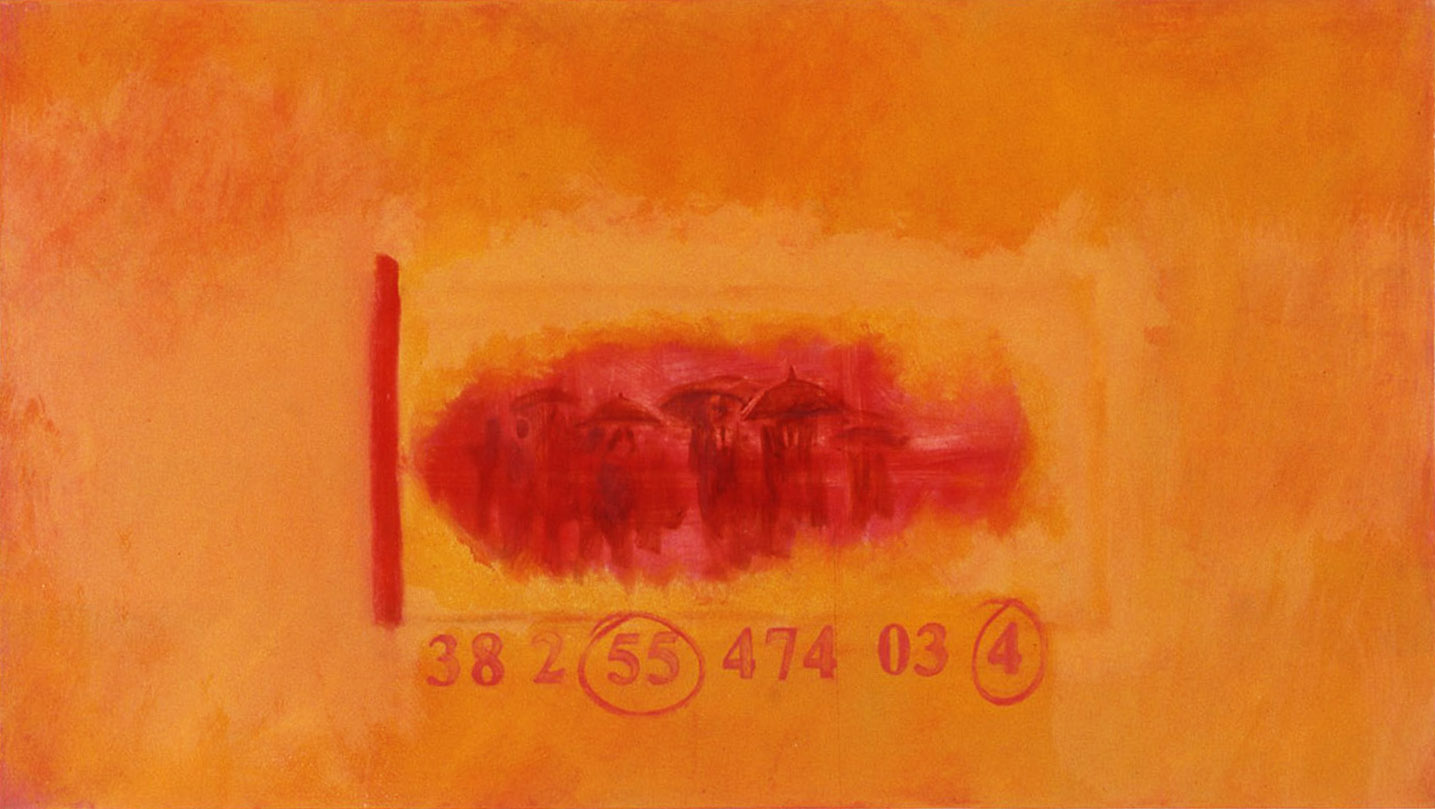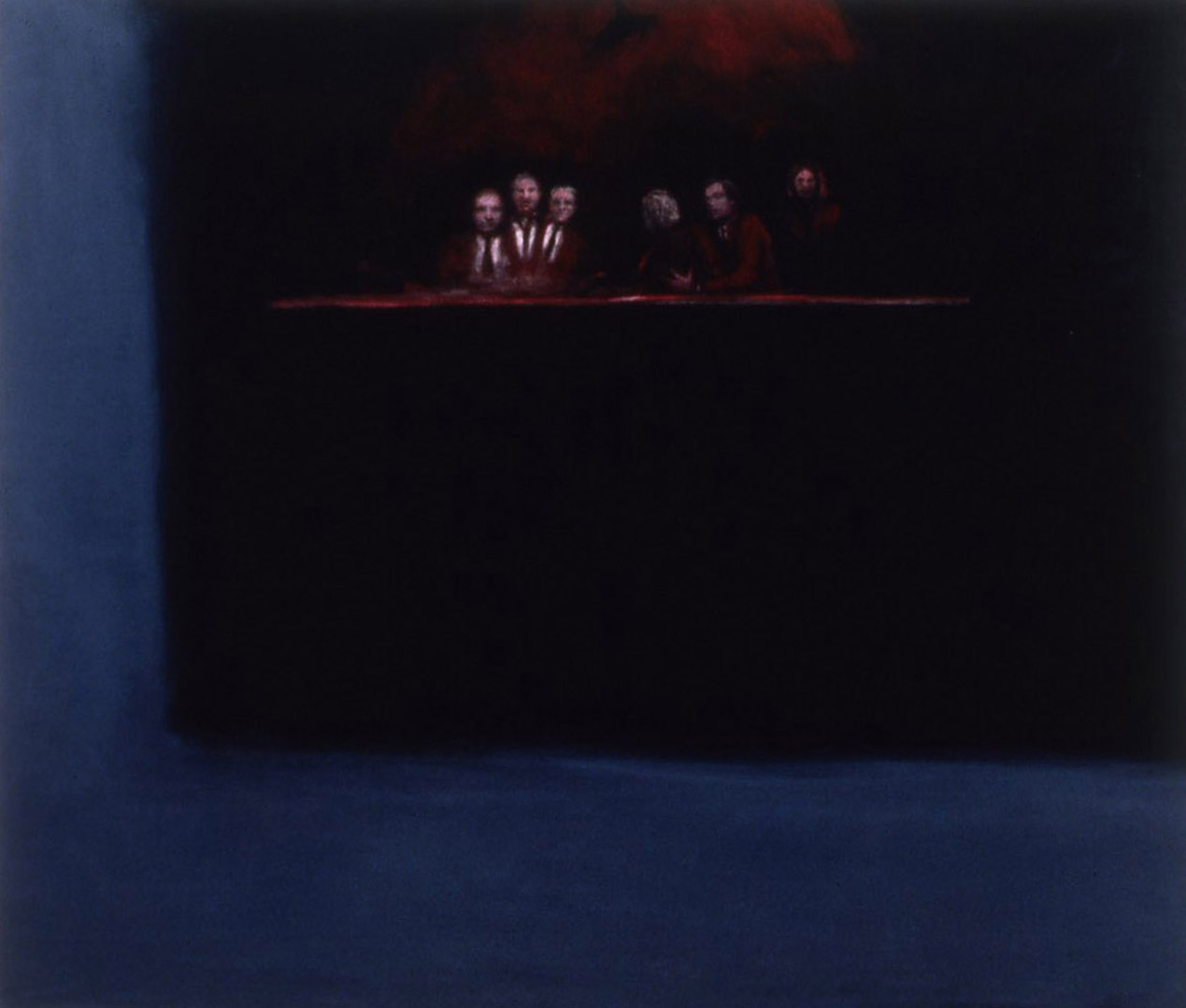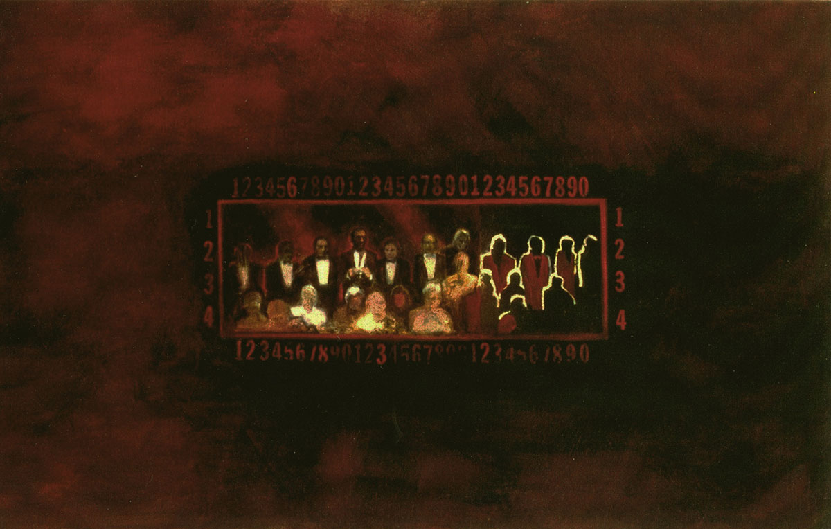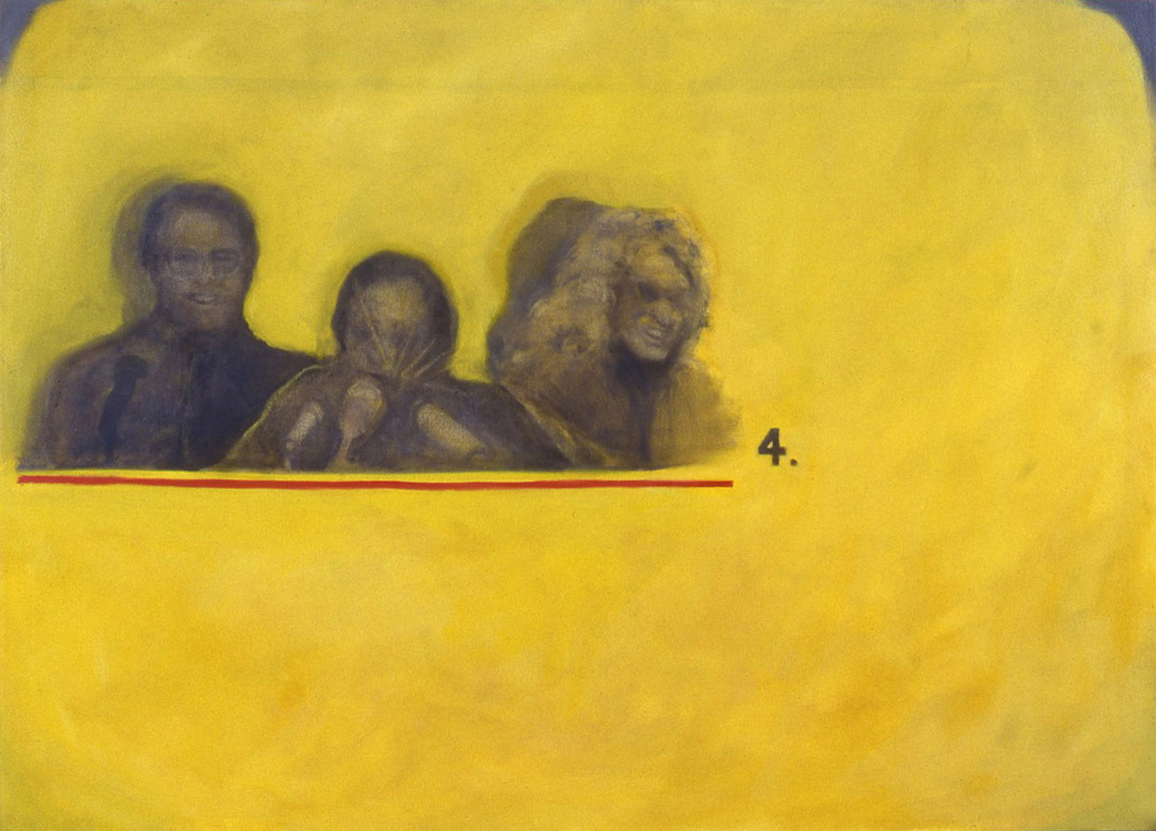 A. M. HOCH, One, Two, Three, Seven, oil on canvas, 64 x 90 inches, 1991 A. M. HOCH, Coup, oil on canvas, 62 x 72 inches, 1991 A. M. HOCH, On/Off/Record, oil on canvas, 56 x 84 inches, 1992 A. M. HOCH, Press Conference, oil on canvas, 52 x 72, 1991A. M. HOCH, Aftermath, oil on canvas, 56 x 90 inches, 1992 A. M. HOCH, Eating with Others, oil on canvas, 34.75 x 60 inches, 1992 A. M. HOCH, Lucky Day, oil on canvas, 25 x 44 inches, 1993A. M. HOCH, Drivers, oil on canvas, approximately 31 x 54 inches, 1992 A. M. HOCH, Another Game Show (Panel of Experts), oil on canvas, 31.50 x 54 inches, 1994 A. M. HOCH, Self-portrait as a Game Show Contestant, oil on canvas, 36 x 24 inches, 1992 A. M. HOCH, Cosmic Debris, oil on canvas, 72 x 56 inches, 1994