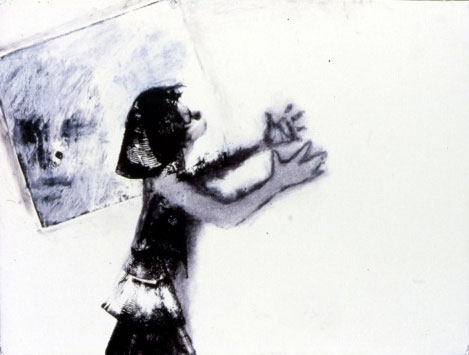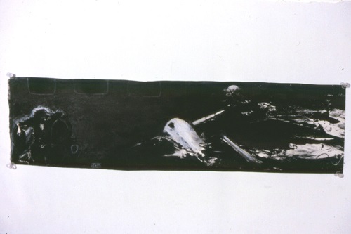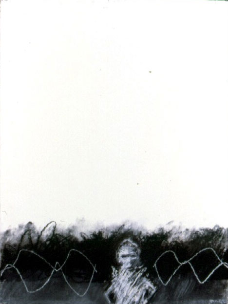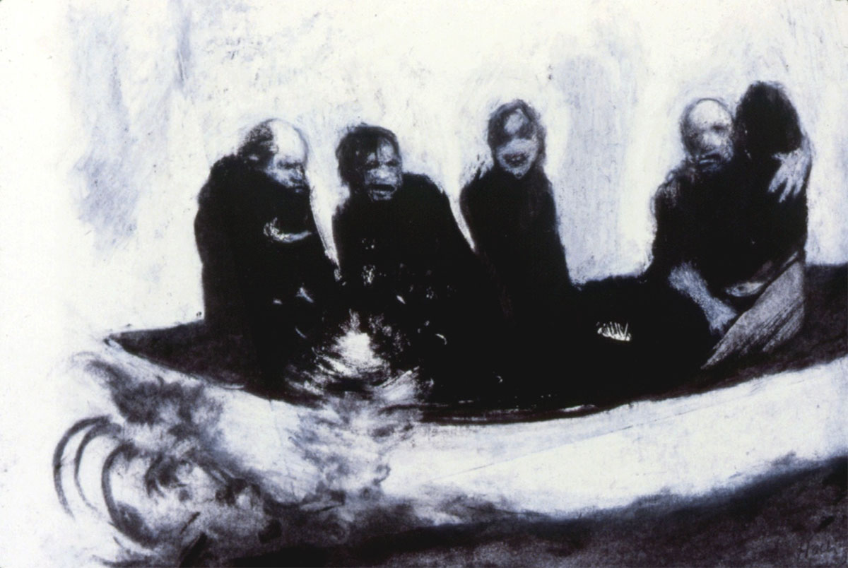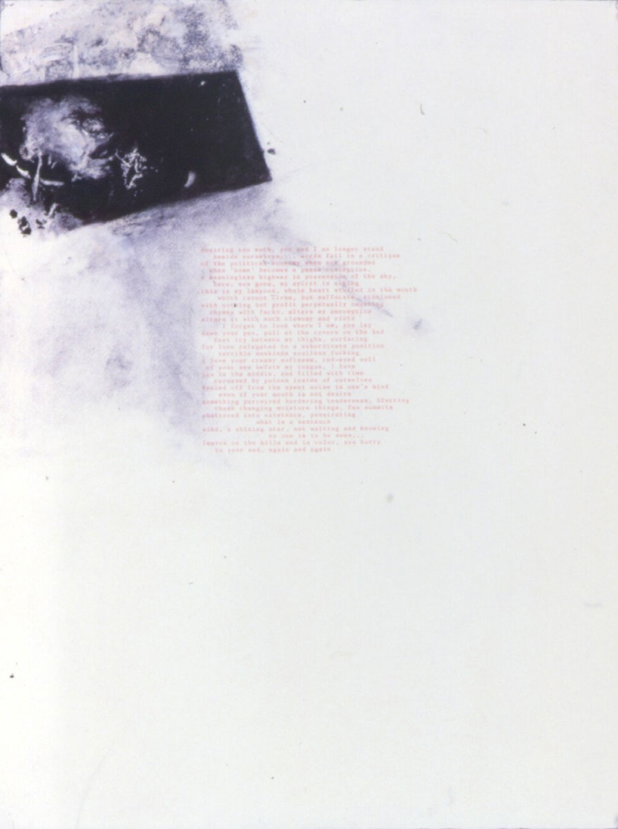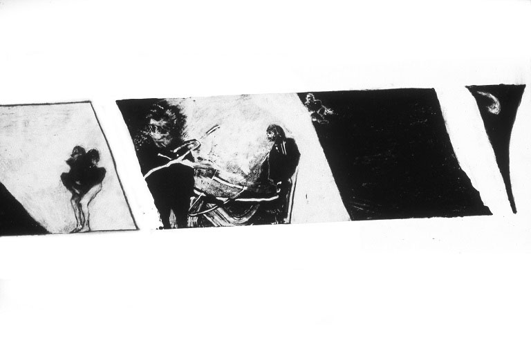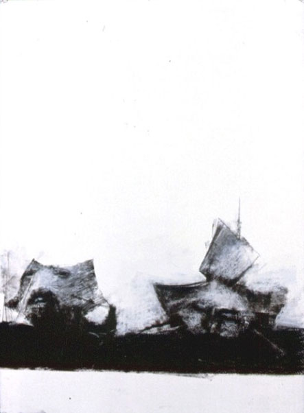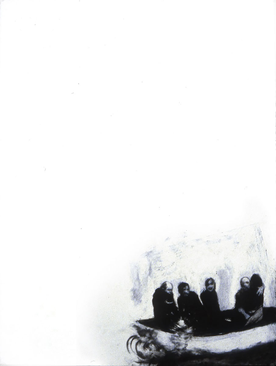 A. M. HOCH, Ship of Fools, monoprint with chalk on paper, 30 x 22 inches, 1988 A. M. HOCH, Ship of Fools, DETAIL, monoprint with chalk on paper, 30 x 22 inches, 1988A. M. HOCH, In Pieces, DETAIL, monoprint, chalk, and charcoal, 41.5 x 29.5 inches 1989 A. M. HOCH, Out of the Corner of my Eye, monoprint, chalk, and charcoal, 22.5 x 30 inches, 1988 A. M. HOCH, Two Boat Heads, monoprint, chalk, and charcoal, 30 x 22 inches, 1988 A. M. HOCH, Spinning Head, monoprint, chalk, and charcoal, 30 x 22 inches, 1988 A. M. HOCH, Self-portrait on Airplane, monoprint, chalk, and charcoal, 30 x 23 inches, 1988 A. M. Hoch, Sleep Walker, monoprint, chalk, and charcoal, 16.75 x 29 inches, 1988 A. M. HOCH, Vibrating Figure, monoprint, chalk, and charcoal, 30 x 22.50 inches, 1988 A. M. HOCH, Collaboration with Andrew Levy, poem “desiring too much”, no. 1, litho type with monoprint and chalk on paper, approx. 30 x 22 inches, 1988A. M. HOCH, Collaboration with Andrew Levy, poem “desiring too much”, no. 2, litho type with monoprint and chalk on paper, approx. 20 x 15 inches, 1988